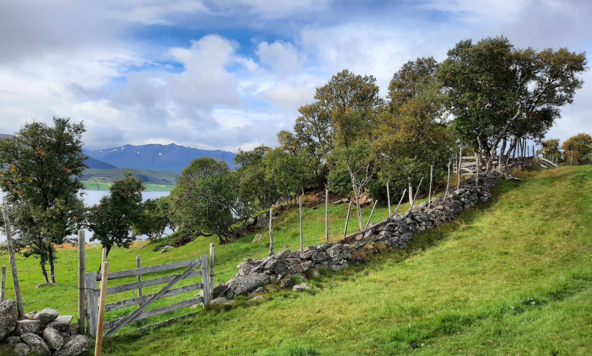Du går stort sett på tvers av bruksgrensene, mellom innmark og utmark, mellom fjord og fjell. Her ser du sporene som folk og dyr har satt etter seg, fra jernalderens graver til dagens sauetråkk.